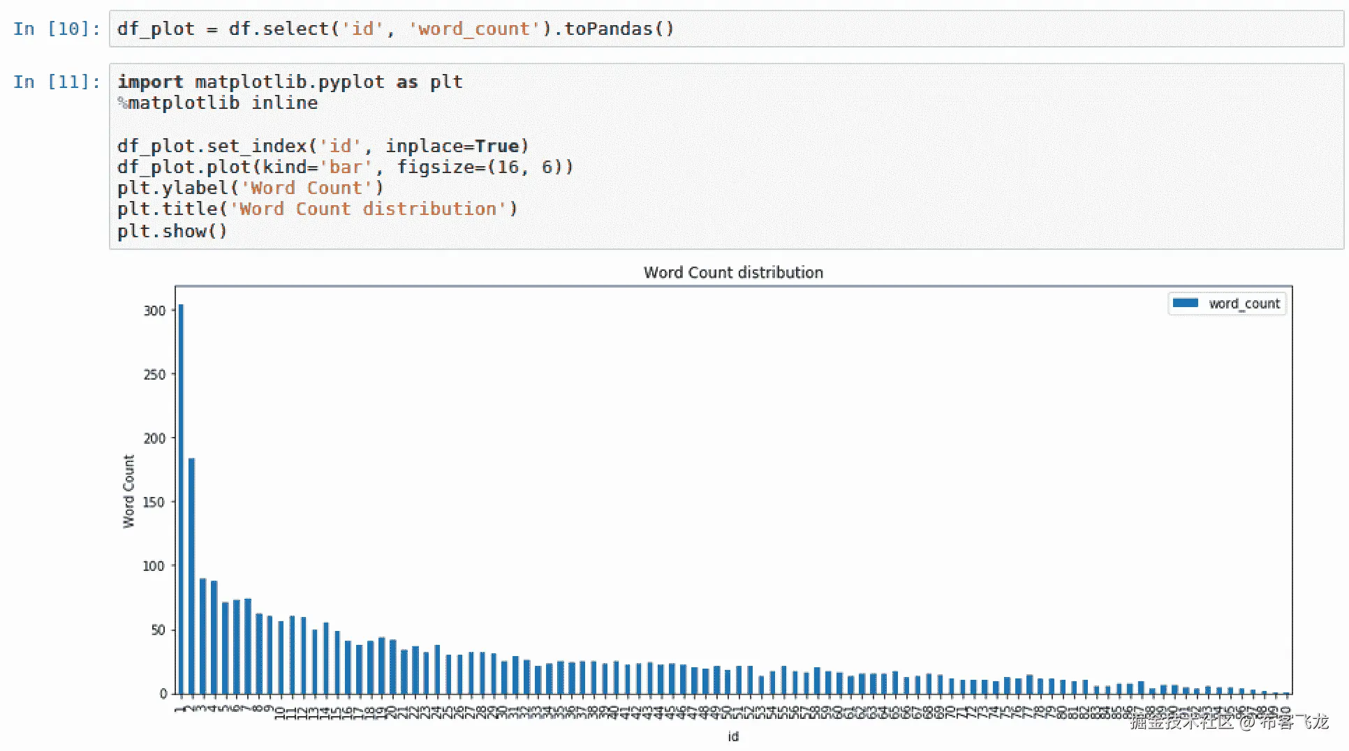 请注意,每当我们将 Spark 数据框转换为 pandas 数据框时,它可能并不总是适合大数据。虽然在我们使用相对较小的数据集时它可以正常工作,但转换为 pandas 数据框意味着所有数据都将加载到主驱动程序的内存中。一旦发生此转换,数据不会存储在 Spark 工作节点中,而是传输到主驱动节点。这并不是最优的,可能会导致内存溢出错误。如果你发现需要从 Spark 转换为 pandas 数据框来可视化数据,建议从 Spark 中抽取一个随机样本,或将 Spark 数据聚合成一个更易处理的数据集,然后在 pandas 中进行可视化。