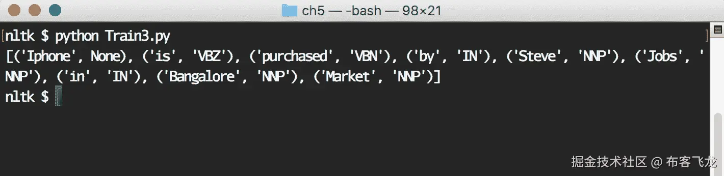 在这条指令中,我们调用了 Python 内置的print()函数,它将给定的参数打印到屏幕上。在我们的例子中,我们可以看到一个元组列表,每个元组包含原始单词和词性标识符。