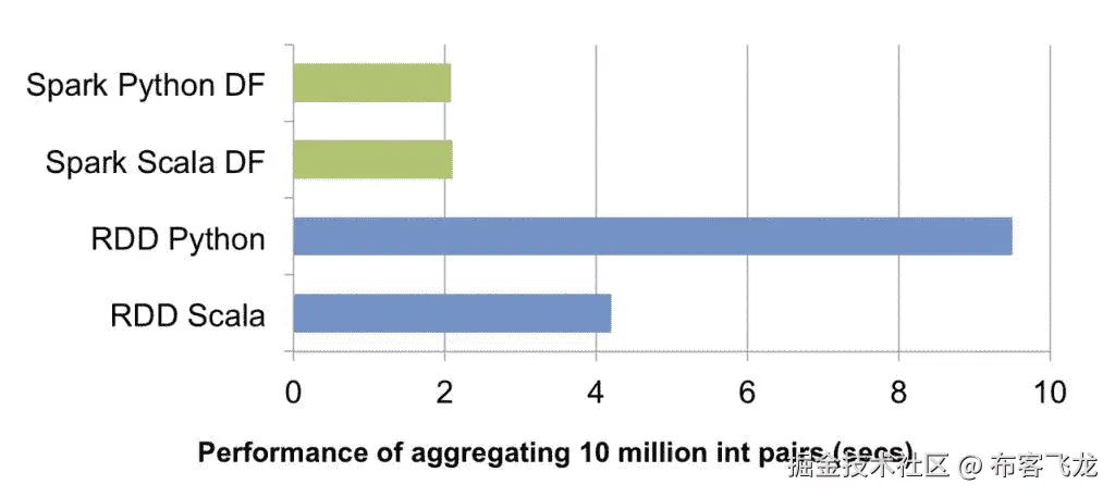 通常情况下,与 Spark DataFrames 相比,使用 RDDs 通常会有较慢的性能,如下图所示:
