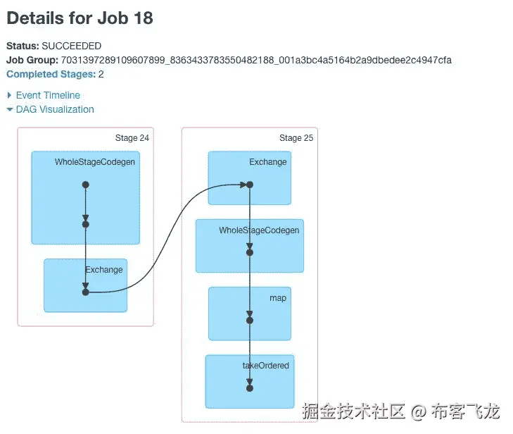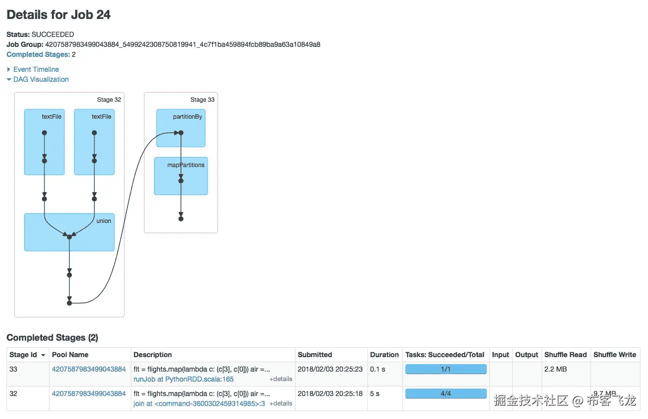 每个作业都会生成自己的一组阶段,最初读取文本(或 CSV)文件,执行reduceByKey(),并执行sortByKey()函数: