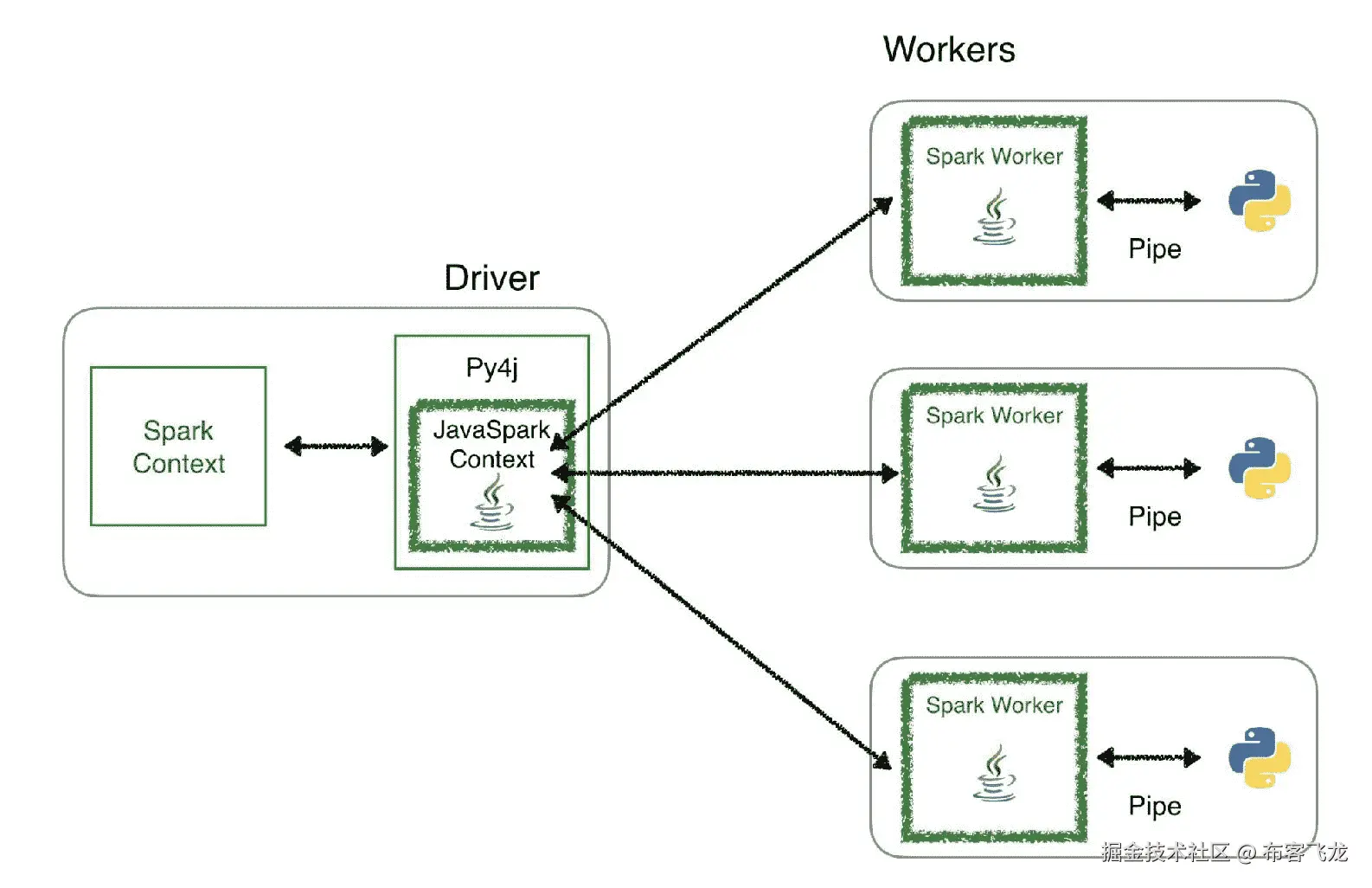 虽然这种方法允许 PySpark 将数据处理分布到多个 Python subprocesses上的多个工作节点,但正如您所看到的,Python 和 JVM 之间存在大量的上下文切换和通信开销。