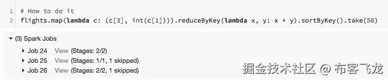 为了更好地了解以前的 RDD 和 DataFrame 的性能,让我们返回到 Spark UI。首先,当我们运行flights RDD 查询时,将执行三个单独的作业,如在以下截图中在 Databricks Community Edition 中可以看到的那样: