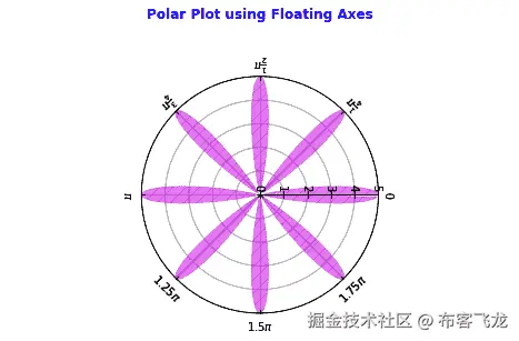 curv2rect_tr = PolarAxes.PolarTransform()定义极坐标变换函数。angle_ticks是用于角度坐标的刻度的字典,其中包含角度的值及其相应的文本表示形式。grid_locator1 = FixedLocator([value for value, string in angle_ticks])为角度坐标定义了网格定位器。FixedLocator()定义了字典指定的固定位置的刻度/网格位置。tick_formatter1 = DictFormatter(dict(angle_ticks))格式化要显示的角度坐标值。grid_locator2 = MaxNLocator(5)指定半径坐标的网格定位器。 数字5表示在半径图上应该有 5 条网格线。grid_helper = floating_axes.GridHelperCurveLinear()定义网格助手函数。 对于两个坐标,它以相反的顺序使用限制,即上限,然后是下限。 我们使用了(2*pi, 0, 5, 0),这意味着角度的上限为2 * pi,下限为零。 同样,半径的上限为 5,下限为零。main_axes = floating_axes.FloatingSubplot(fig, 111, grid_helper=grid_helper)定义主轴域。parasite_ax = main_axes.get_aux_axes(curv2rect_tr)定义了从属轴域。parasite_ax.fill(theta, 5*np.cos(8*theta), color=(0.8,0.0,0.9), hatch='//', alpha=0.5)使用填充方法和阴影线绘制极坐标图。color=(0.8,0.0,0.9)是使用 RGB 通道组合的自定义颜色。main_axes.grid(True, zorder=0)将网格线设置为可见。 网格线将在主图之前绘制,因此它们位于主图的背景中。