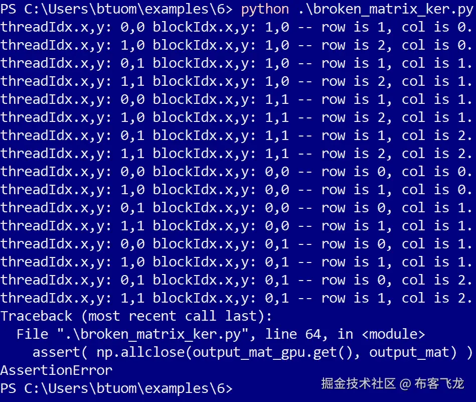 当我们运行程序时,会有更多的行输出,但我们会看到一行说—threadIdx.x,y: 0,0 blockIdx.x,y: 1,0 -- row is 2, col is 0.,还有另一行说—threadIdx.x,y: 0,0 blockIdx.x,y: 1,0 -- row is 0, col is 2, N is 4。通过threadIdx和blockIdx的值,我们看到这是同一个块中的同一个线程,但row和col的值是颠倒的。实际上,当我们查看rowcol_dot设备函数的调用时,我们看到row和col确实是与设备函数声明中的相反。我们修复了这个问题,但当我们再次运行程序时,又出现了另一个断言错误。