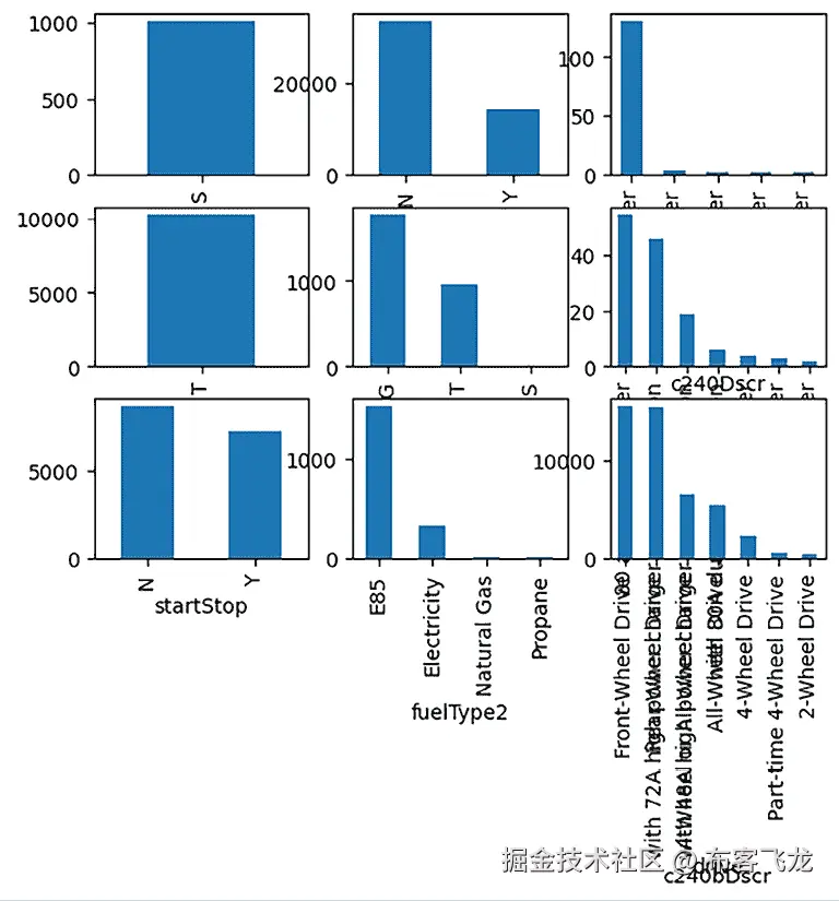 通过这个可视化,我们可以更容易地从高层次理解我们的数据集。mpgData列中的N出现频率明显高于Y。对于guzzler列,我们看到G值大约是T值的两倍。对于c240Dscr列,我们可以看到绝大多数条目都是standard,尽管总体上,我们的整个数据集中只有略多于 100 行分配了这个值,因此我们可能会决定没有足够的测量数据可靠地使用它。