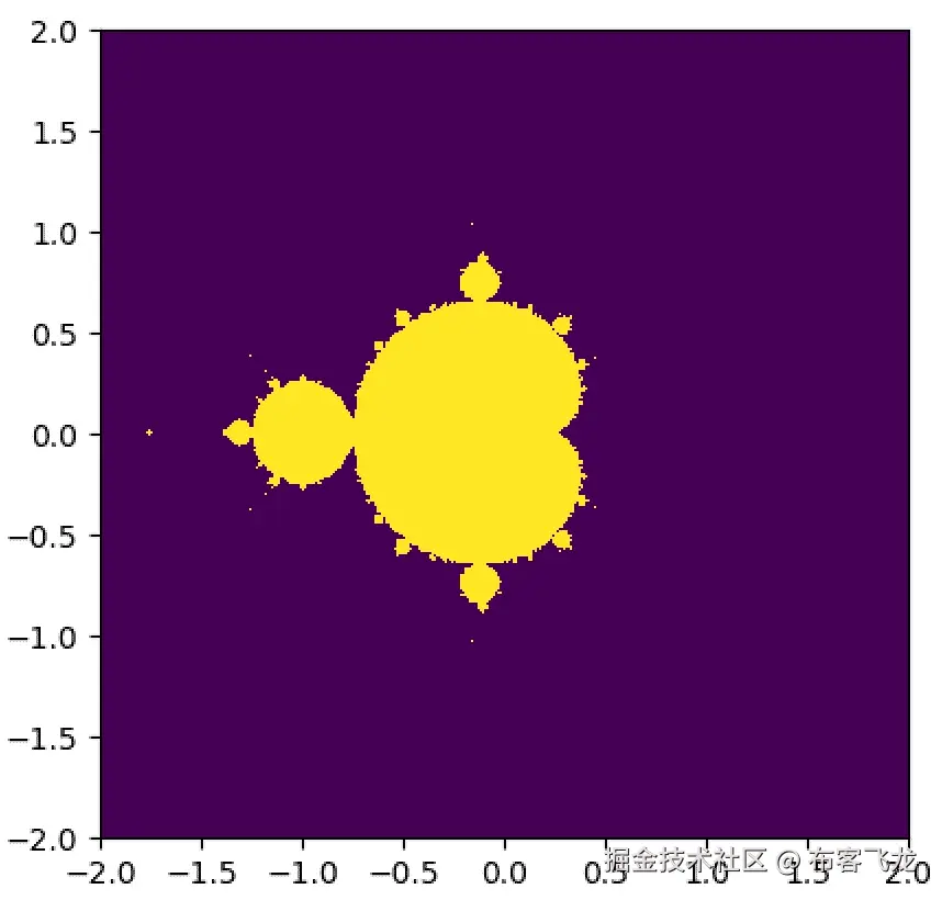 让我们思考一分钟关于这将如何工作:我们将使用一个单一的一维数组来存储实部和虚部,称为lattice,其长度为lattice_size。我们将使用这个数组来计算一个形状为(lattice_size, lattice_size)的二维 Mandelbrot 图形,存储在预先分配的数组mandelbrot_graph中。我们将指定每个点检查发散的迭代次数为max_iters,通过使用upper_bound_squared提供其平方值来指定之前的最大上限值。(我们稍后会看一下使用平方的动机。)