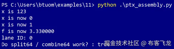 输出应该如预期那样。与从 PyCUDA 启动 CUDA 内核的情况一样,我们必须同样小心地将输入转换为 Ctypes 函数。