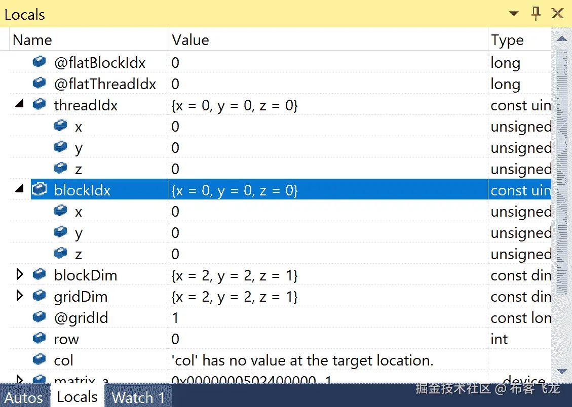让我们从内核的入口点开始。我们看到两个变量row和col,所以我们应该立即检查这些。让我们在设置它们之后立即放上一行代码(因为这是在两个维度上并行化的,我们应该打印threadIdx和blockIdx的x和y值):