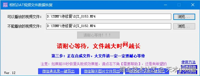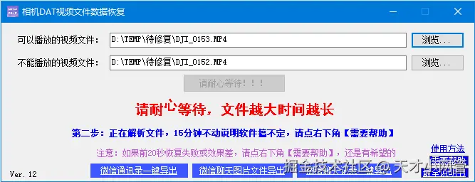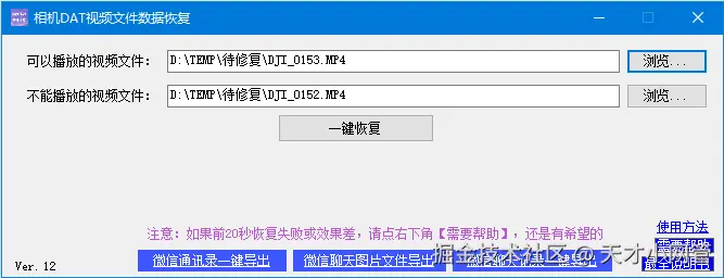 三、软件打开后,使用方法很简单,只有两个格子需要填,按格子中的红字的指导来选择即可,第一个格子要选择可以播放的视频,第二个格子选择那个坏的文件