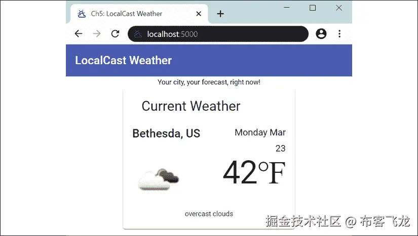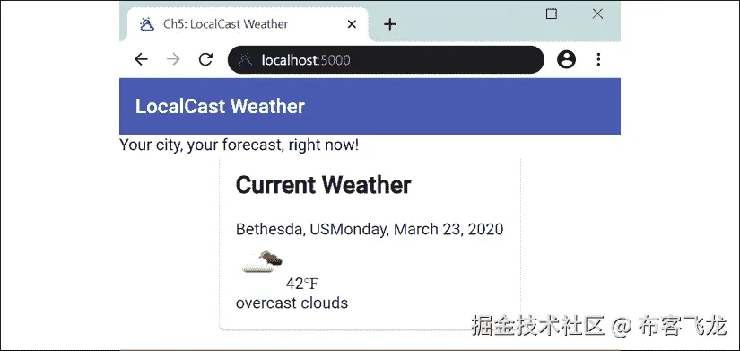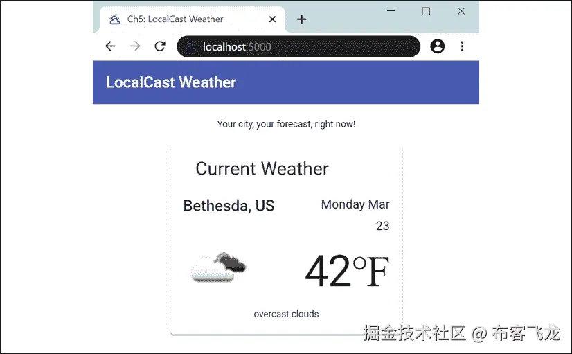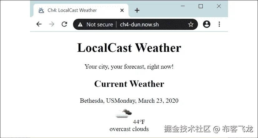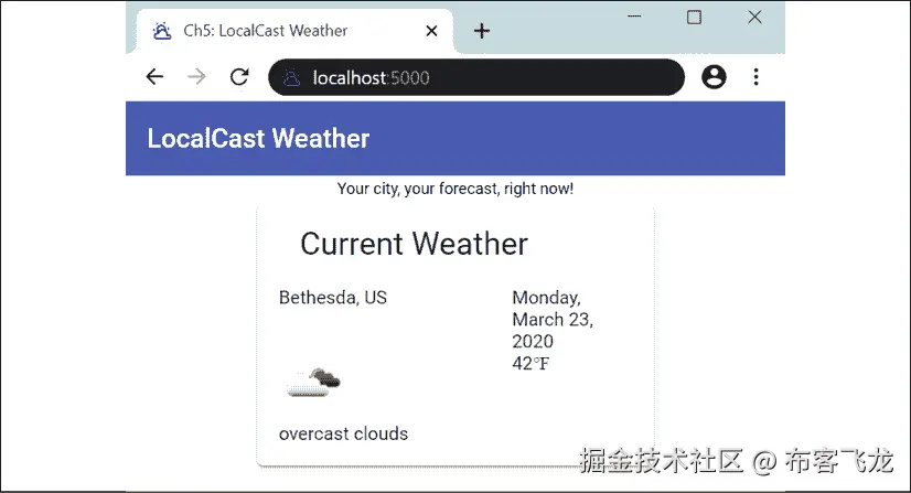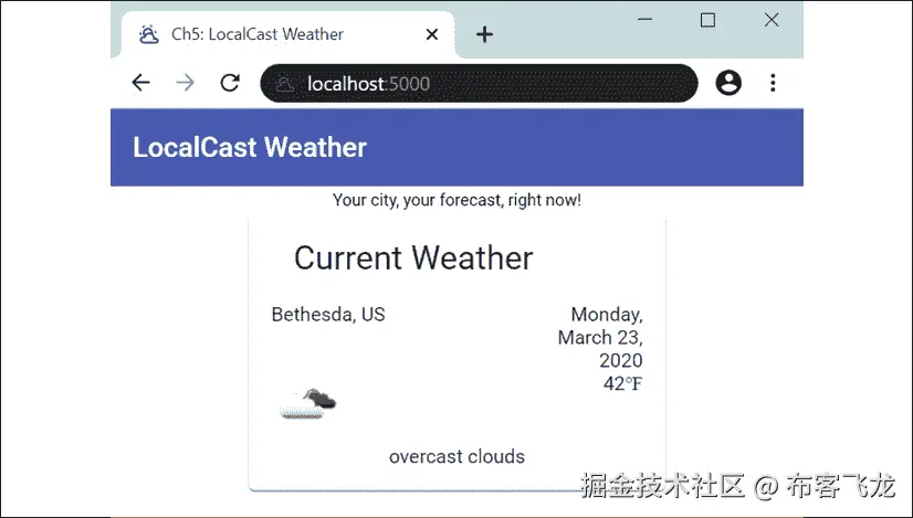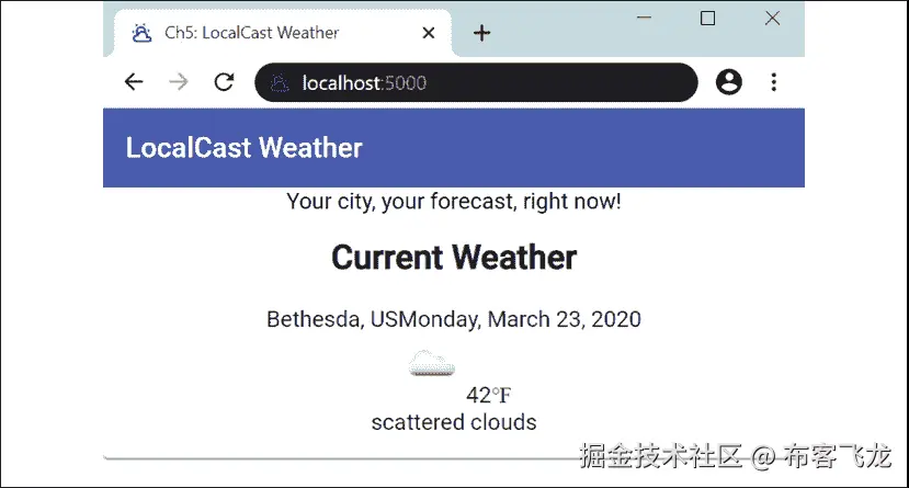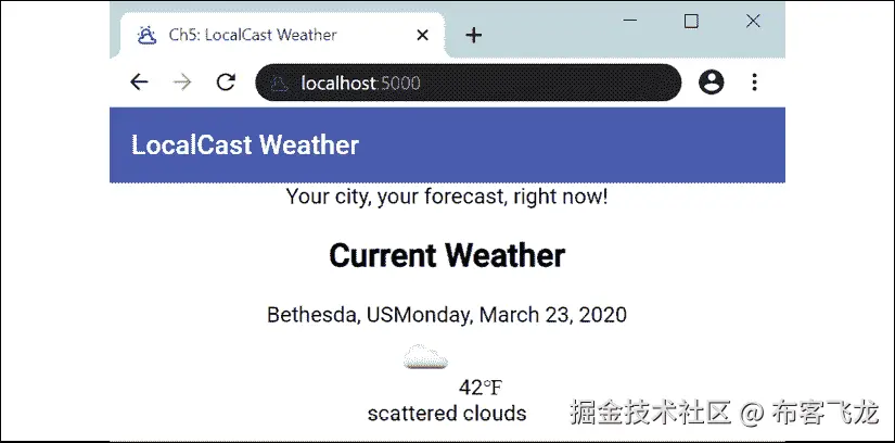 alt属性,将无法确定图片的用途。由于这是一个动态图片,一个静态的alt属性,如当前天气图标,将不利于我们的用户。然而,将当前天气描述值绑定为属性是合适的。我们可以像下面这样修复可访问性问题:**src/app/current-weather/current-weather.component.html** ... <img style="zoom: 175%" [src]="current.image" [alt]="current.description" /> -