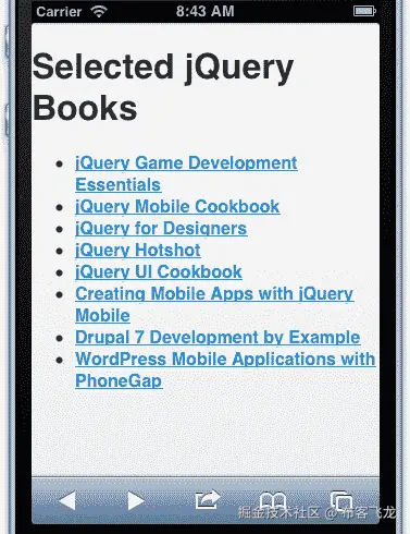 jQuery Mobile 样式现在应用于我们的文档,显示出更大的无衬线字体,更新颜色和间距,如下图所示: