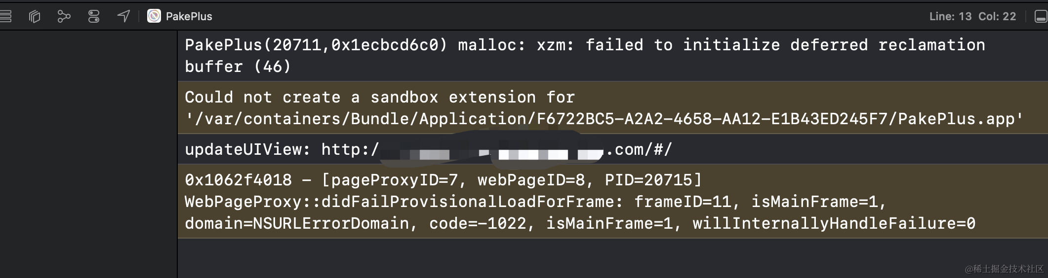 updateUIView: http://www.xxxxxxx.com/#/ 0x101ee8018 - [pageProxyID=7, webPageID=8, PID=20664] WebPageProxy::didFailProvisionalLoadForFrame: frameID=11, isMainFrame=1, domain=NSURLErrorDomain, code=-1022, isMainFrame=1, willInternallyHandleFailure=0