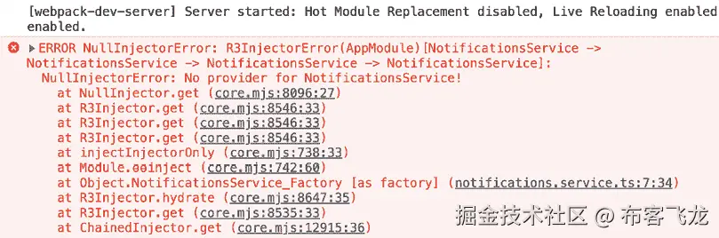 NotificationsService。你应该在控制台中看到以下内容:图 3.8:一个详细说明 NotificationsService 无法注入到 NotificationsService 的错误