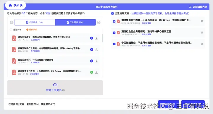基于你的研究主题,首先平台会为你搜索推荐一些跟这个公司相关的参考资料,当然你也可以选择将自己搜索到的相关文件和素材,手动上传并添加为参考资料,然后点击开始生成研究报告。
