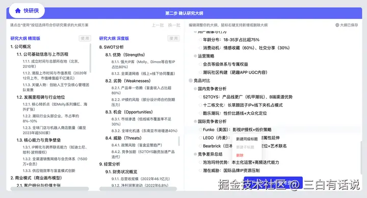 AI基于你刚刚输入的研究主题生成一个专业的公司研究大纲,覆盖公司概况、商业模式、SWOT分析、经营分析、产品分析、竞品分析等多个一级研究主题,并且每个一级研究主题下都下钻拆分到三级研究大纲;