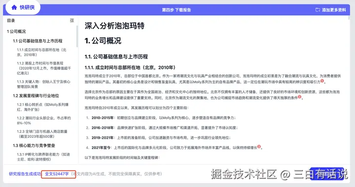 接下来,AI会批量的阅读和学习你提供的参考资料,然后基于你的大纲思路创作一篇研究大纲,对于参考资料里面没有涉及的信息,大模型会基于自己本身的知识积累自主创作,最后一次性生成一篇5万字以上的研究报告,通过这篇研究报告,你就可以快速的了解这家公司,如下,我们已经生成了一篇5万字以上的关于泡泡玛特的深度研究报告,可以点击下载报告原文到电脑本地。