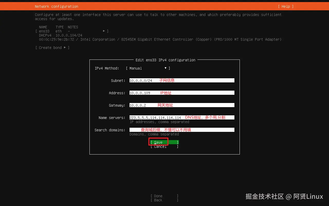 Subnet:子网,Address:IP地址,Gateway:网关,Name servers:DNS,Search domains:查询域后缀(可以不填)