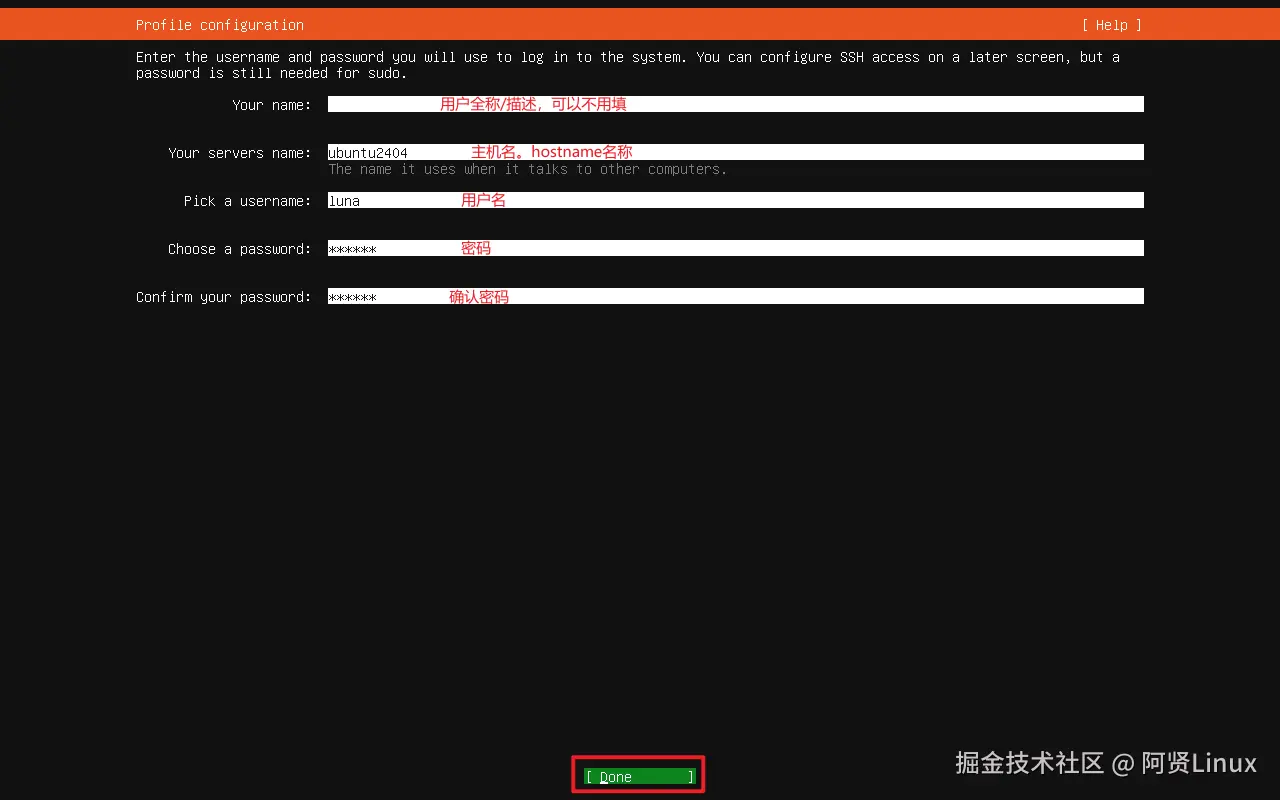 Your name:用户名全程/描述,可以不用填写;Your servers name:主机名,hostname名称; Pick a username:用户名;Choose a password:密码;Confirm your password:确认密码