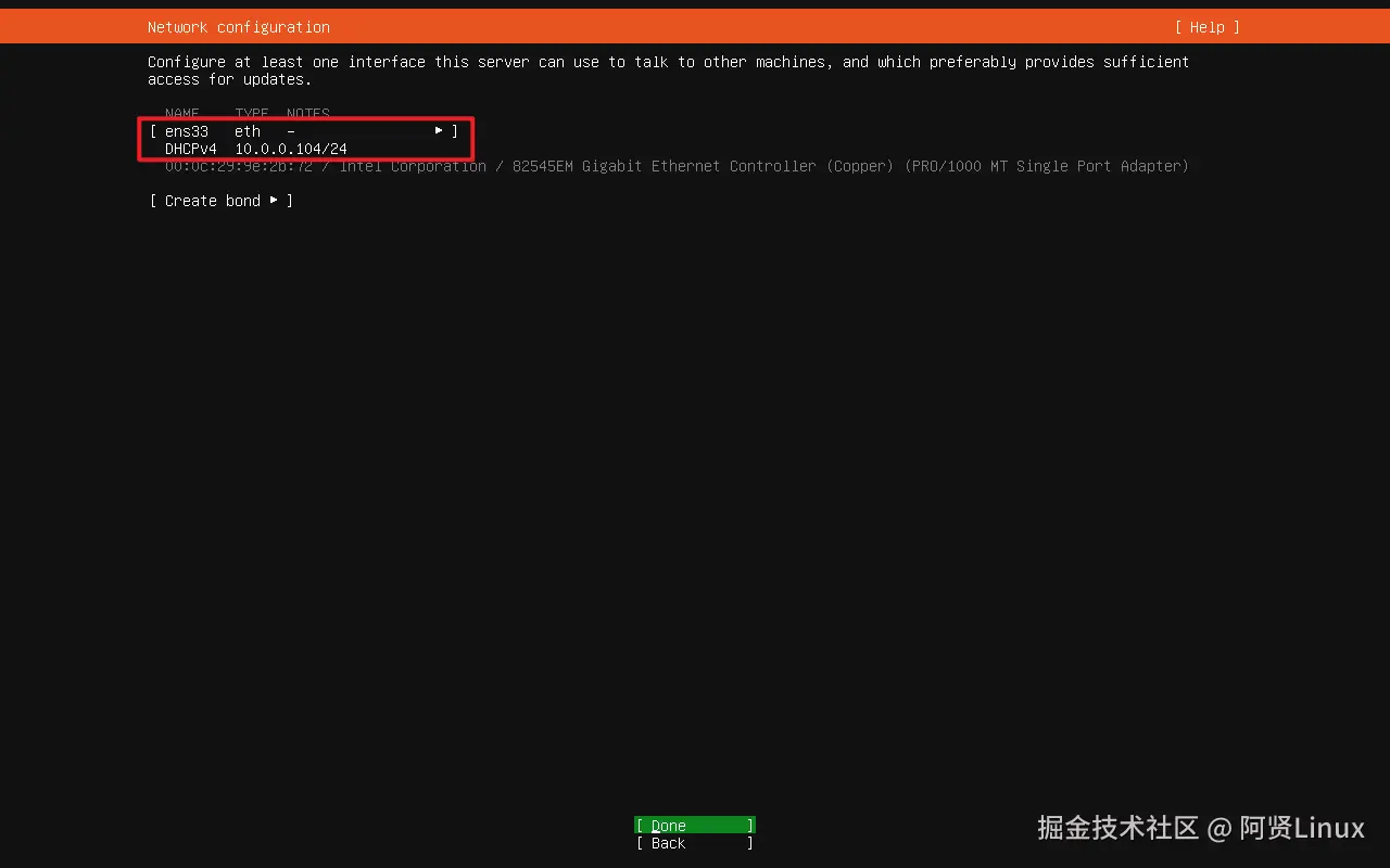 默认为dhcp,这里可以看到分配的ip为10.0.0.104(采用默认回车即可,自定义可看下面步骤)