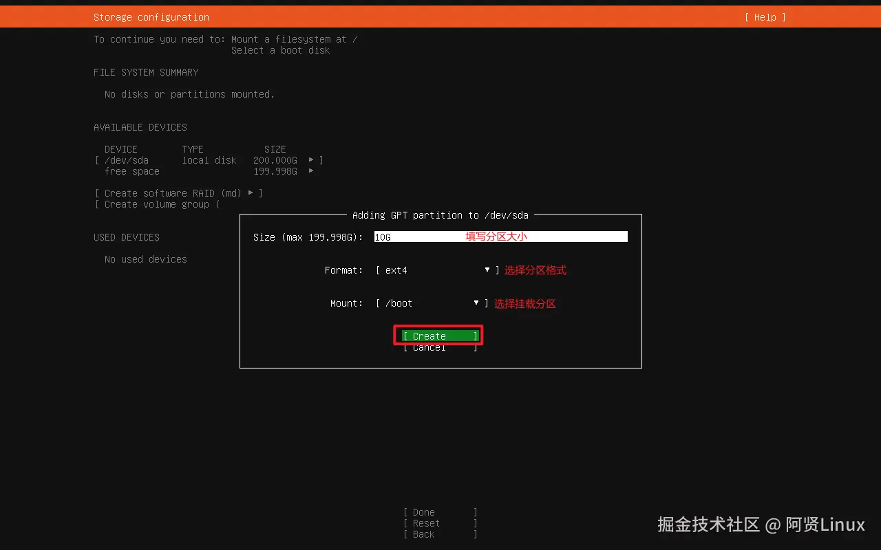 填写分区大小,输入10G---选择ext4格式---选择挂载点/boot(回车可选择)---移至Create回车创建分区