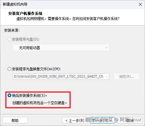 稍后安装操作系统(一定选择这个,否则会用默认配置进行安装,无法自定义配置)