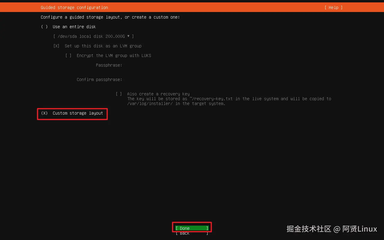 下键移至Custom storage layout,空格键选中(选中后前面有个X),再移至Done回车下一步