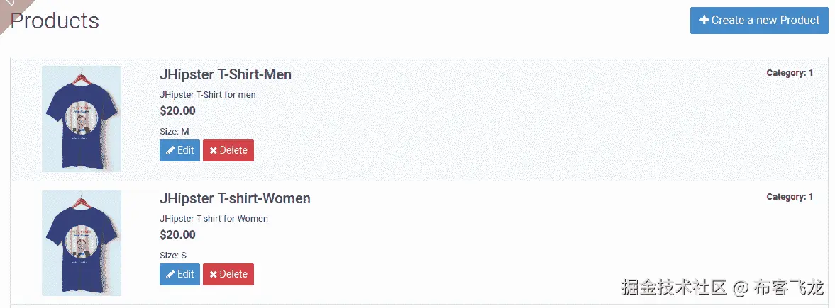 让我们从自定义product.component.html文件开始,以更新产品列表的 UI 视图。当前的 HTML 代码渲染一个表格视图,并使用一些 Angular 指令来增强视图,包括排序和分页。让我们首先将视图从表格更改为列表,但首先通过导航到http://localhost:9000打开 BrowserSync 的开发 web 服务器(如果尚未打开)。登录并导航到实体 | 产品类别,创建一个类别,然后导航到实体 | 产品,创建一些新产品,以便我们有东西可以列出: