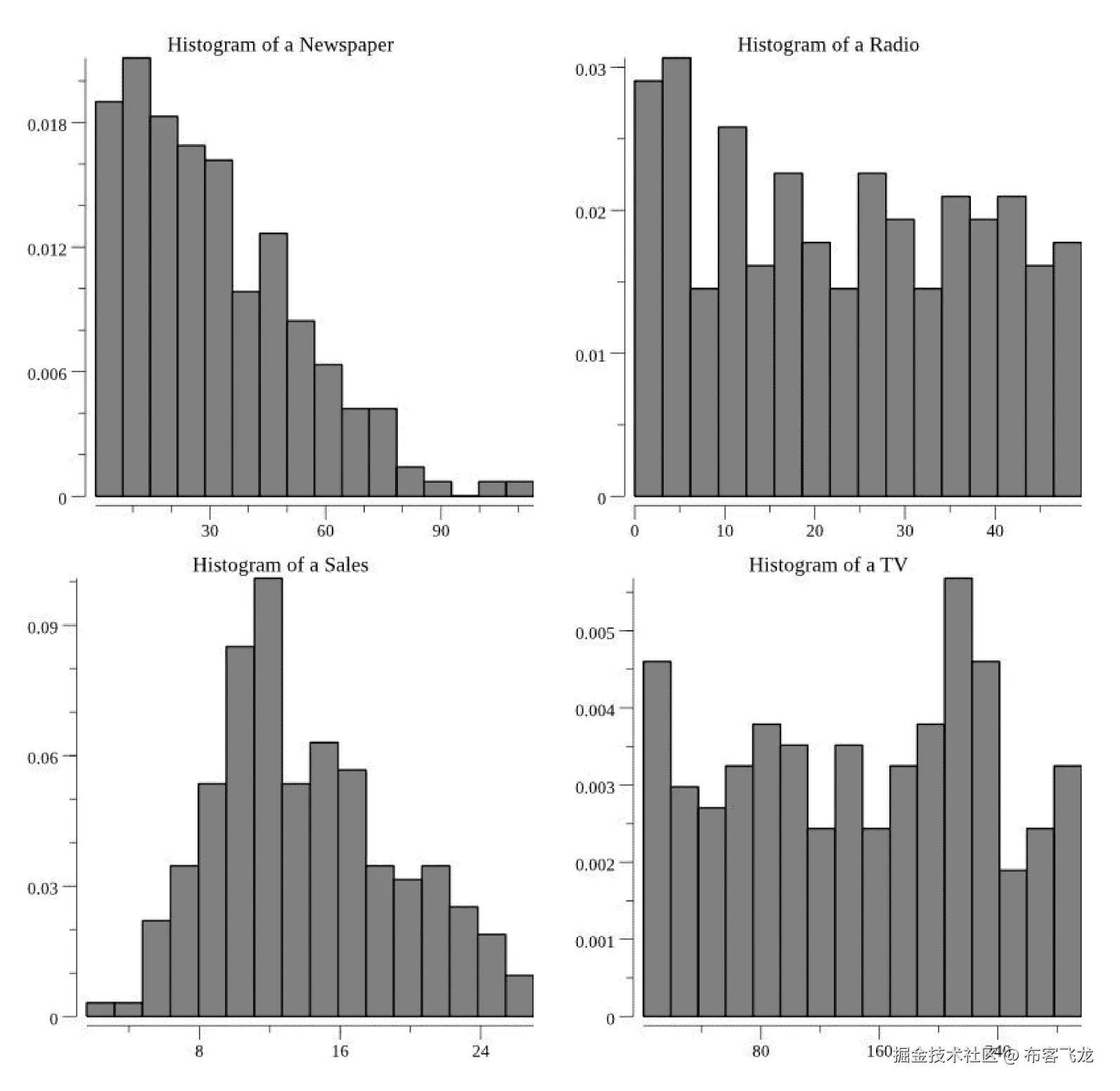 这些值为我们提供了在训练线性回归模型时将看到的数字的良好数值参考。然而,这并没有给我们一个很好的数据视觉理解。为此,我们将为每个列中的值创建直方图: