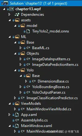 ImageClassificationPredictor类,与第十二章中提到的类似,即使用 ML.NET 与 TensorFlow 结合使用,其中包含了运行图像预测的方法。在本章中,我们需要创建几个额外的类对象来支持 ONNX 模型的运行,具体如下: