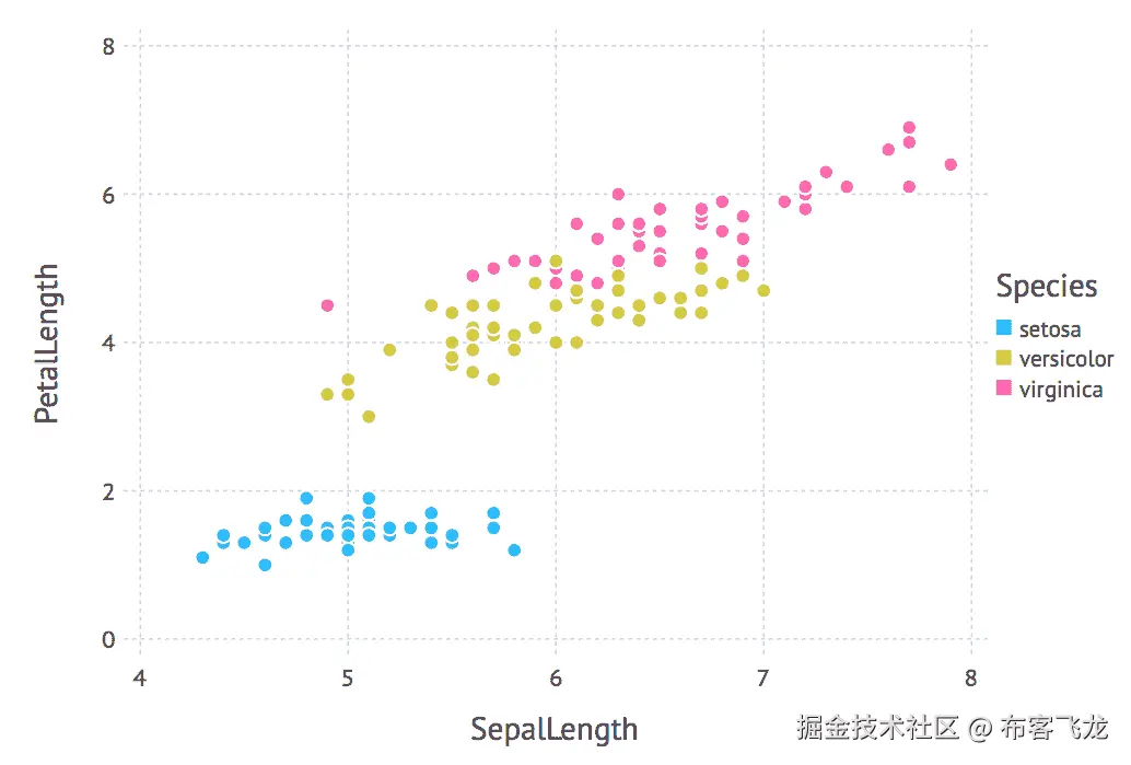 在上一节中,我们已经确定SepalLength和PetalLength之间存在强烈的协变关系。让我们绘制这些数据: