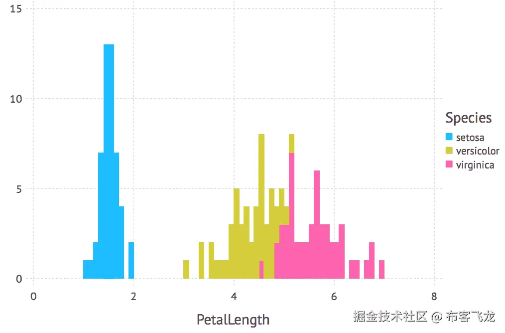 julia> plot(iris, x=:PetalLength, color=:Species, Geom.histogram)