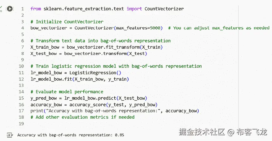 让我们从实现词袋模型开始。之后,我们将继续到词嵌入。以下是词袋模型的代码: