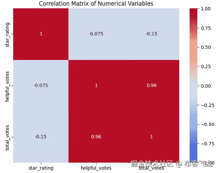 相关性分析: 最后,我们将使用相关矩阵或散点图来调查星级评分、有帮助的投票和总投票等数值变量之间的相关性。这种分析有助于识别数据不同定量方面的潜在关系。