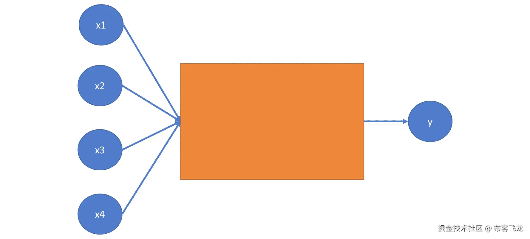 假设f是激活函数,x1,x2,x3和x4是输入,它们的和与权重w1,w2,w3和w4相乘: