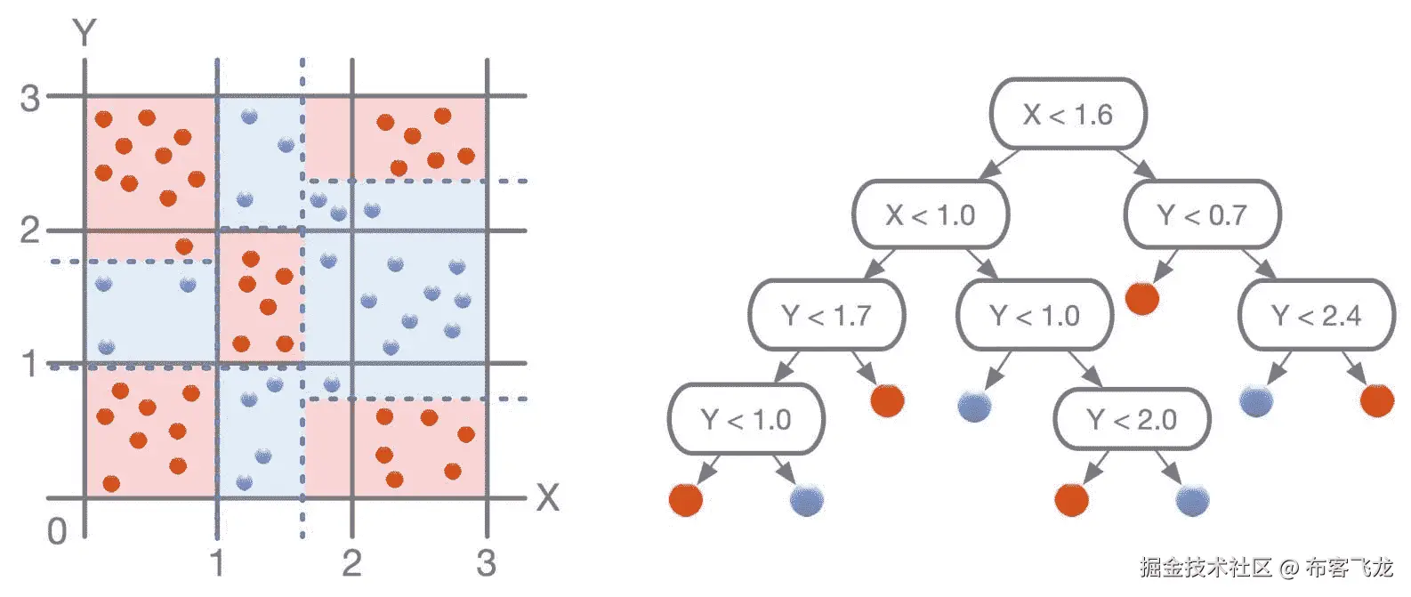 图 4 - 最终的决策树及其预测在原始点空间中的投影。