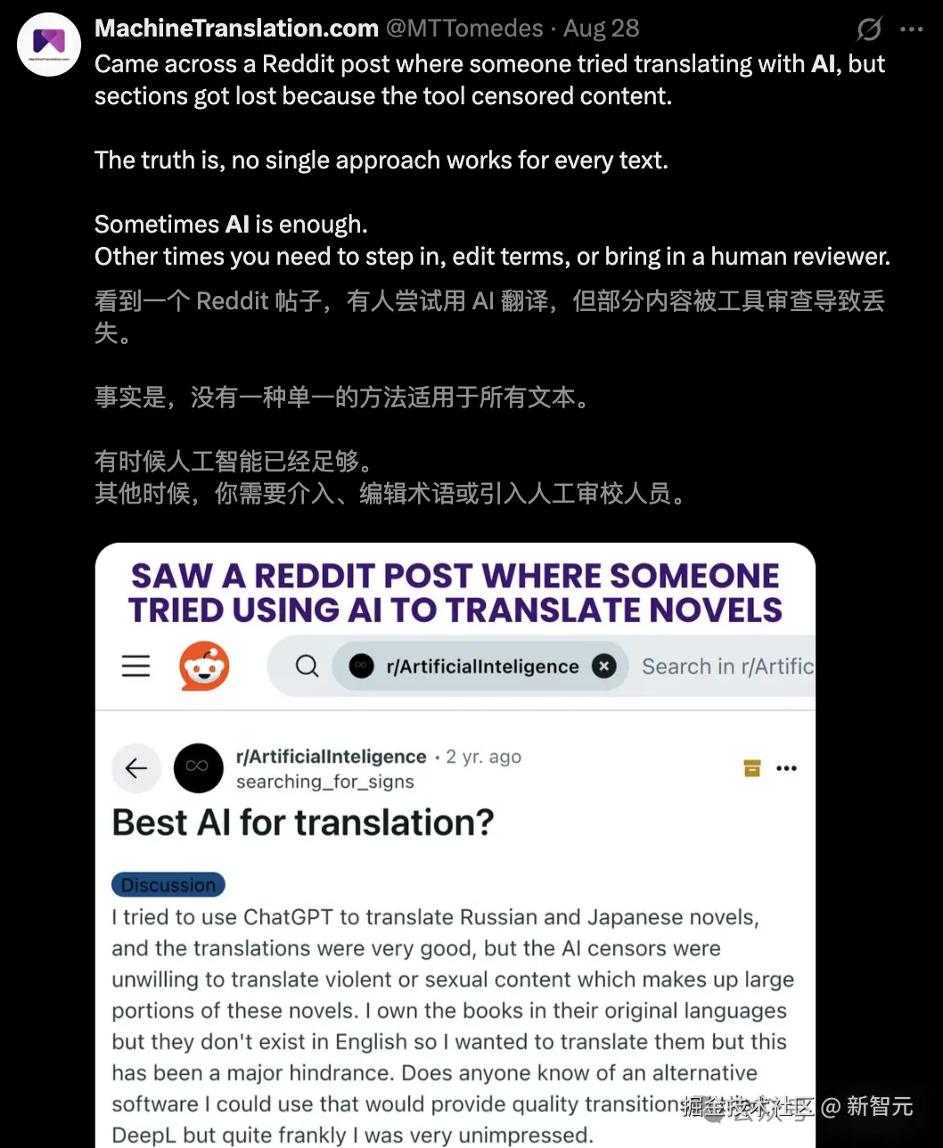 还有 Reddit 网友用 AI 翻译时,也翻车了。因为工具自动屏蔽内容,好多段落直接消失了。