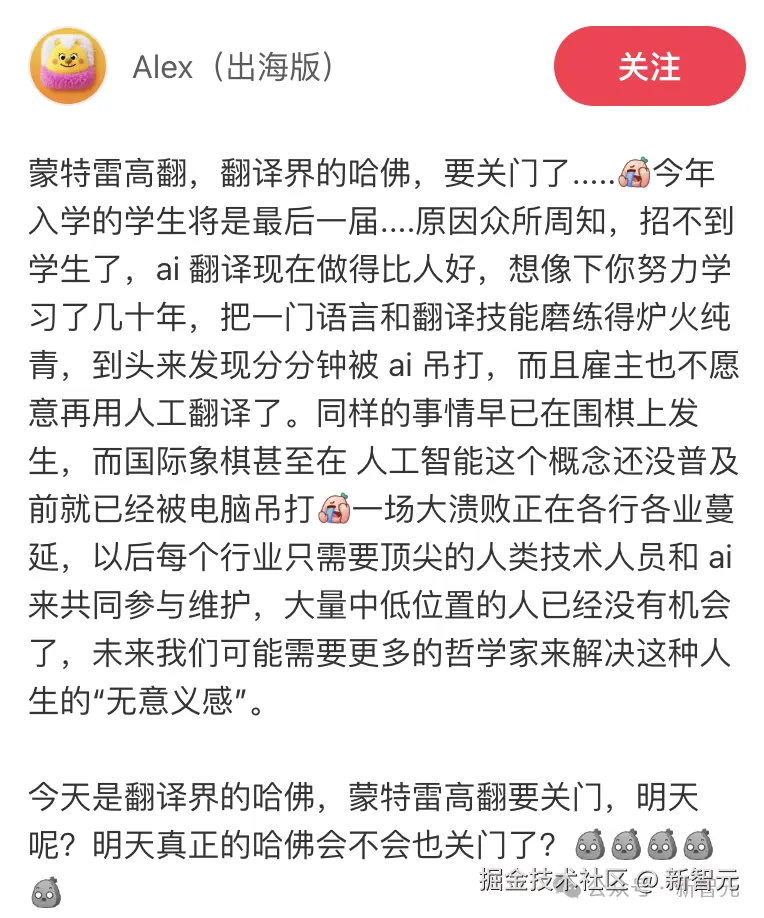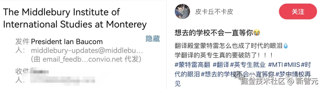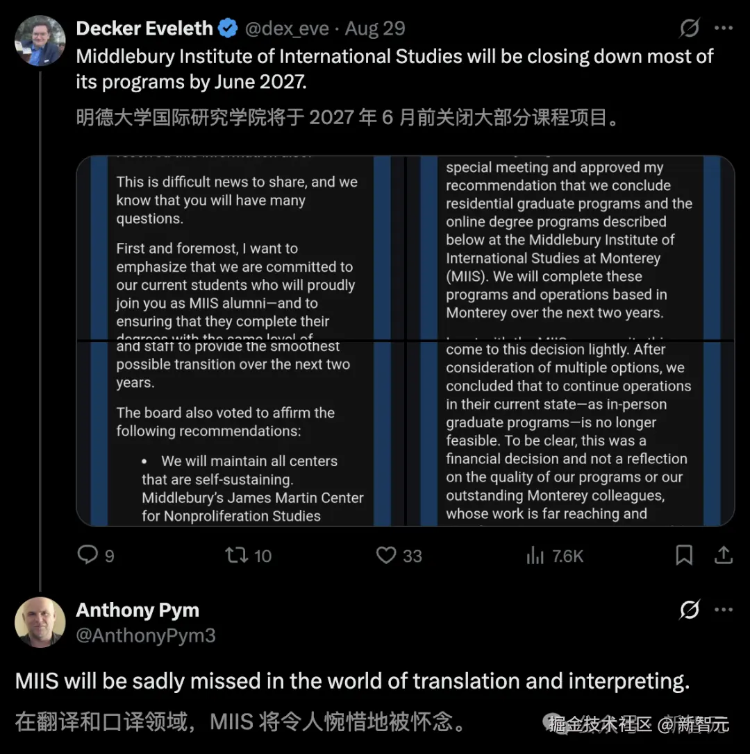 「【新智元导读】全球三大高翻院之一,蒙特雷国际研究学院(MIIS)官宣,2026 年 7 月正式停招研究生。生源不足、财务问题之下,许多人还将矛头指向了 AI。如今,机翻精度高、又快又准,突然理解,什么是时代的眼泪了。」