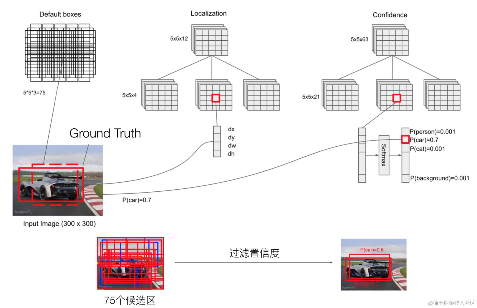 也就是说SSD中提供事先计算好的候选框这样的机制,只不过不需要再像RPN那种筛选调整,而是直接经过prior boxes之后做回归操作(因为confidence中提供了21个类别概率可以筛选出背景)