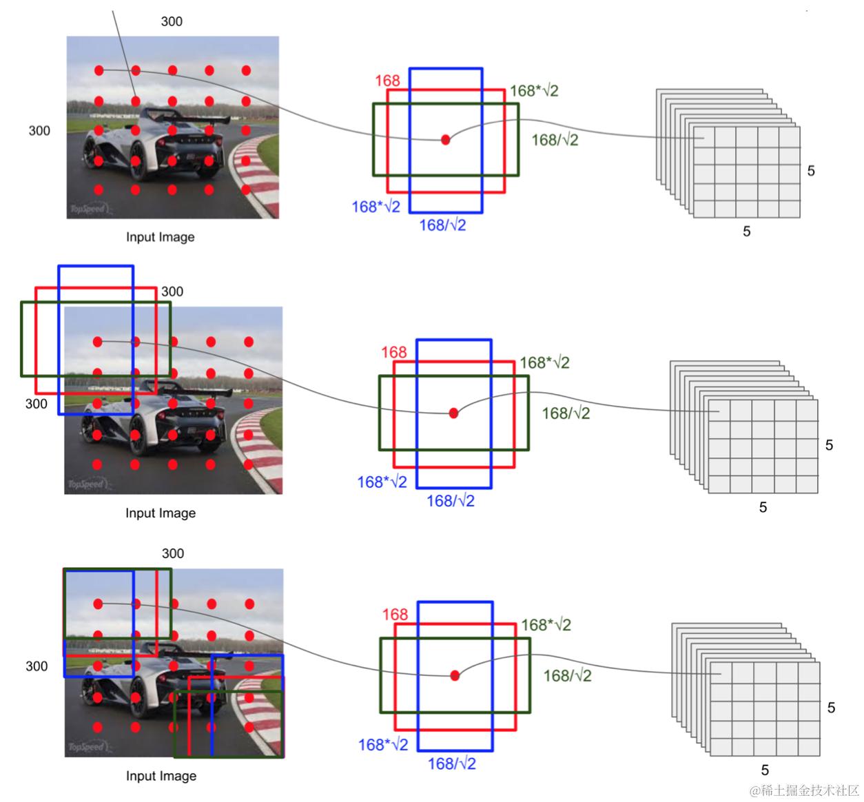 SSD中引入了Defalut Box,实际上与Faster R-CNN的anchor box机制类似,就是预设一些目标预选框,不同的是在不同尺度feature map所有特征点上是使用不同的prior boxes