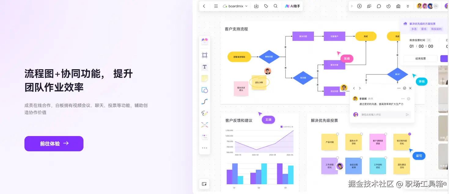 相比传统的Word协作方式,专业的流程图软件往往具备强大的协作功能。以前面介绍的AI流程图软件boardmix为例,它基于无限画布的设计理念,为团队协作提供了极大的便利。在boardmix中,多个团队成员可以同时在同一个画布上进行创作,每个人的操作都会实时显示给其他成员,这种“所见即所得”的协作体验远比传统的文档编辑更加直观。