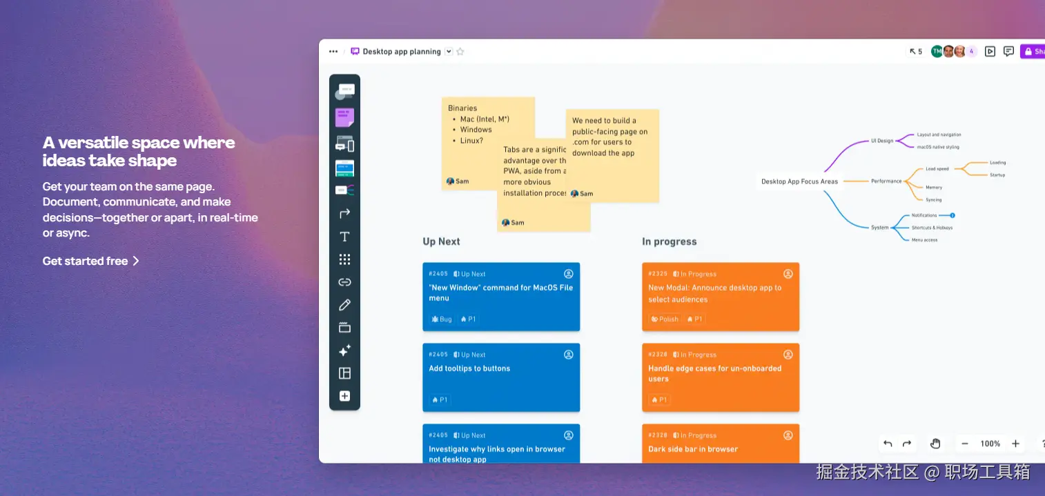 Whimsical是一款以简洁、优雅的设计风格和流畅的用户体验而备受喜爱的在线协作工具。它将思维导图、线框图、便利贴和流程图等多种功能整合在一起,形成了一个统一的视觉化协作空间。