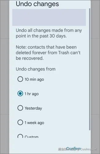 注意: 通过利用 Google 通讯录设置中的撤消更改功能,您可以轻松恢复Android设备上已删除的电话号码。但请注意,当您执行撤消更改操作时,您的联系人将完全恢复到之前的时间点状态,如果您在该时间点之后保存了新号码,请确保对它们进行备份,以避免更多损失。