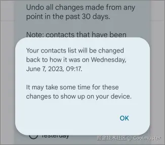 步骤 3. 将出现另一个弹出窗口,告诉您您的联系人列表正在恢复到您选择的时间。点击确定。