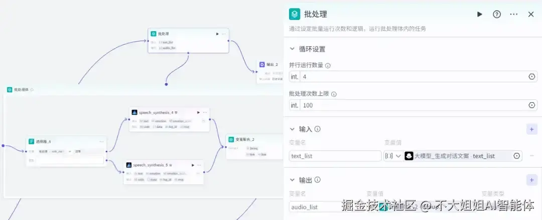 通过并行节点分别生成捧哏/逗哏语音文件,注意设置500ms间隔避免对话重叠