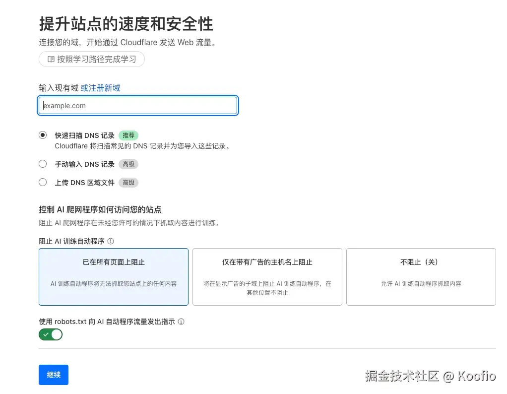 输入 namesilo 的购买的域名,然后快速扫描添加。继续。