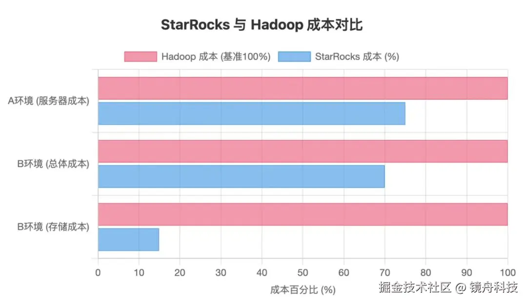 - 计算成本降低: 存算分离架构实现计算资源按需动态伸缩,消除峰值预留造成的资源闲置,同时StarRocks在同等硬件条件下展现出更高的计算效率(吞吐量、QPS)。告别存储与计算 紧耦合 模式(如HDFS要求节点同时承担存储和计算功能),消除了不必要的资源开销。