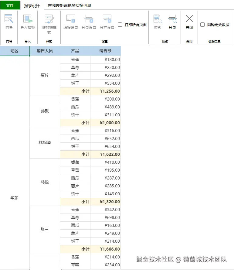 | 销售分组报表 报表数据源多为明细数据; 字段之间存在层级负责级别关系; 各层级包含独立的小计、合计扩展计算逻辑。 |