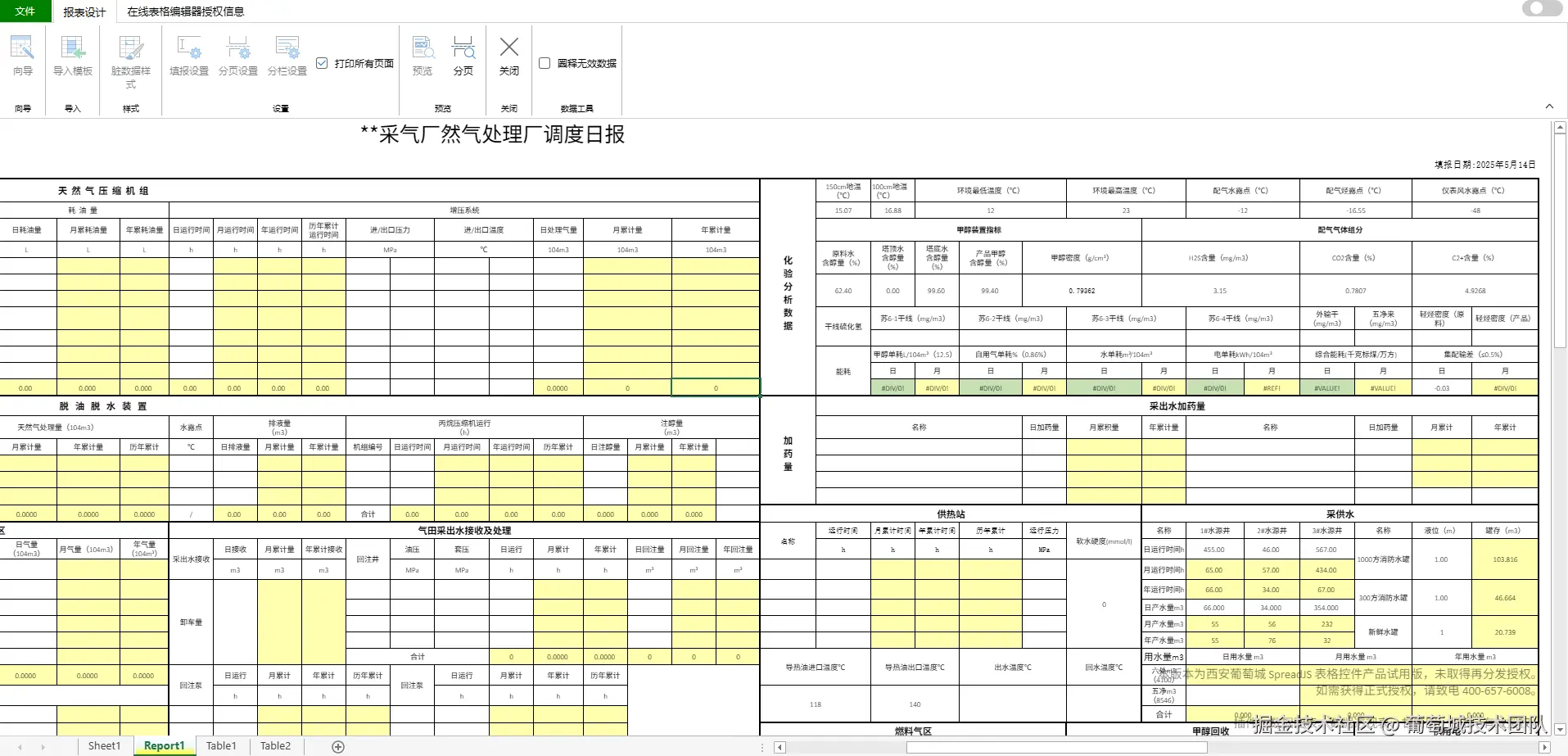 | 设备运行表 报表结构复杂,对接数据源时字段需要同时进行横纵向扩展; 历史报表均为Excel模版,需要复用历史模版,减少开发人员工作量; 只关注计算结果,报表预览时并不要求必须具备excel公式的引用高亮关系; | |