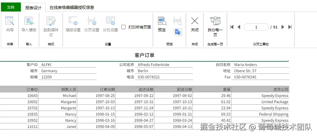 | 客户订单表 报表主体存在一对多关系; 只需设计一个报表模版,根据数据源可扩展出多个不同的客户订单表; 不同订单表需要支持分页展示。 | |