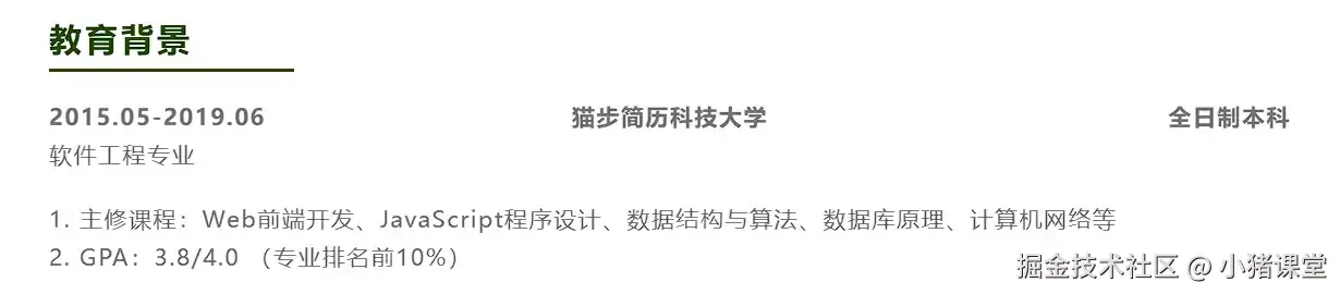 对于应届生来说,这一模块尤为重要,建议这一模块可放在简历靠前的位置。因为HR筛选简历最开始主要是通过这一项来筛选。当然,教育背景一定不能作假,有些同学为了能过简历筛选,将自己的教育背景故意写得较好,但是一但被发现,轻则不录取,重则甚至拉进HR圈子的黑名单里面。
